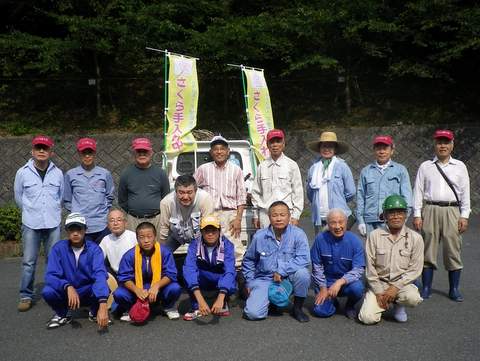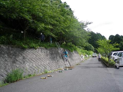 2008年9月14日(日)定例会 午前9時集合、11:30分時作業終了。 昼食(冷やソウメン)。解散。 この日の定例会では42名が集まりました。 作業は3班に別れ、杉林の中の草取り、深坂バイパス崖斜面の桜のかずら払い、深坂茶屋駐車場崖上の草刈が行われました。